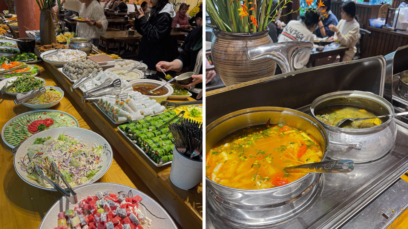 Điểm nhấn chính của nhà hàng chắc chắn là quầy line buffet với số lượng món ăn ấn tượng. Thực đơn tại đây có thể lên đến hơn 50 món chay đa dạng, được thay đổi luân phiên. Nhà hàng rất chú trọng vào việc tự chế biến thủ công các món ăn. Họ cam kết sử dụng nguồn nguyên liệu tươi ngon, được nhập mới mỗi ngày.